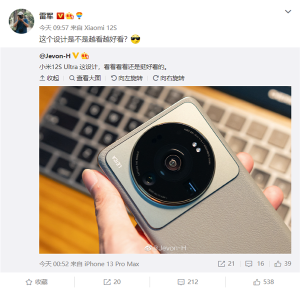 今天上午,雷军本人也在微博上转发了一条内容,问大家这个设计是不是越看越好看?