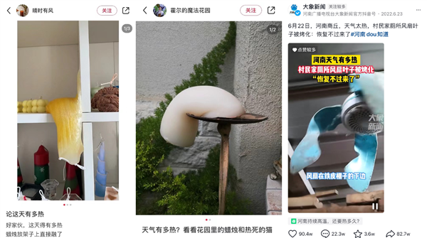“因为下班时太热甚至愿意加会儿班再走。”“我烧到38度多,从医院走到发热门诊出了一身汗,再量体温不烧了,谢谢夏天。”“这个天气,真的,男朋友跟人跑了我也不会去追。”“好晒好热我要像冰淇淋一样化掉了,哦,现在的冰淇淋,烤不化。”
