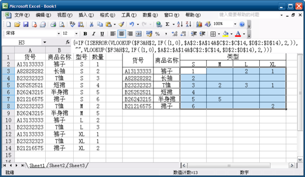 =IF(ISERROR(VLOOKUP($F3&H$2,IF({1,0},$A$2:$A$14&$C$2:$C$14,$D$2:$D$14),2,)),"",VLOOKUP($F3&H$2,IF({1,0},$A$2:$A$14&$C$2:$C$14,$D$2:$D$14),2,))