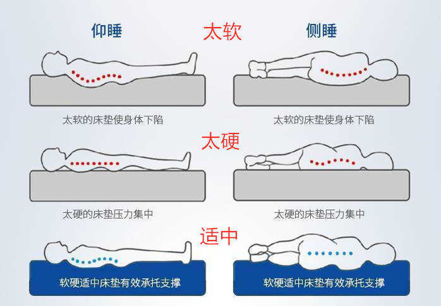 很多人都不清楚自己的睡姿是怎样的,其实您入睡时经常是哪种姿势,那就是您最自然的睡姿。以习惯的睡姿躺下,寻找可以对您的肩部、腰部和臀部都能提供足够承托、使您脊柱保持在同一水平线上的床垫。 侧卧:须保持记住处于同一水平线上,因此应选择柔软的床垫,随肩部和臀部的体形自然变化,给予适宜承托。 仰卧:颈部和腰部需要获得更多承托,因此应选择较硬的床垫,以避免以上身体部位过度陷入床垫。 俯卧:应尝试挑选硬度较大的床垫,尽可能减少颈部和背部受到的压力。