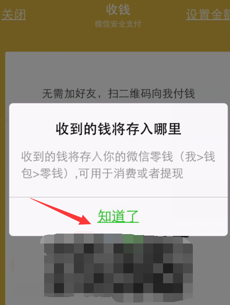 4.接着,在我们点击“收付款”选项后,我们即进入到收钱的管理界面,这里会弹出一个小窗口,我们点击“知道了”选项关闭该窗口。