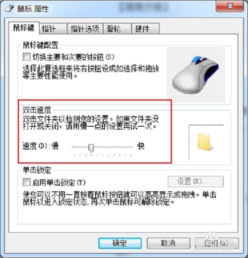 4 第四步进去鼠标属性界面,点击鼠标键,这里可以调节一下鼠标双击的速度,增加鼠标灵敏度,如下图所示: