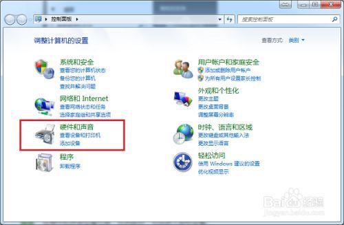 2 第二步进去控制面板界面之后,点击硬件和声音选项,如下图所示: