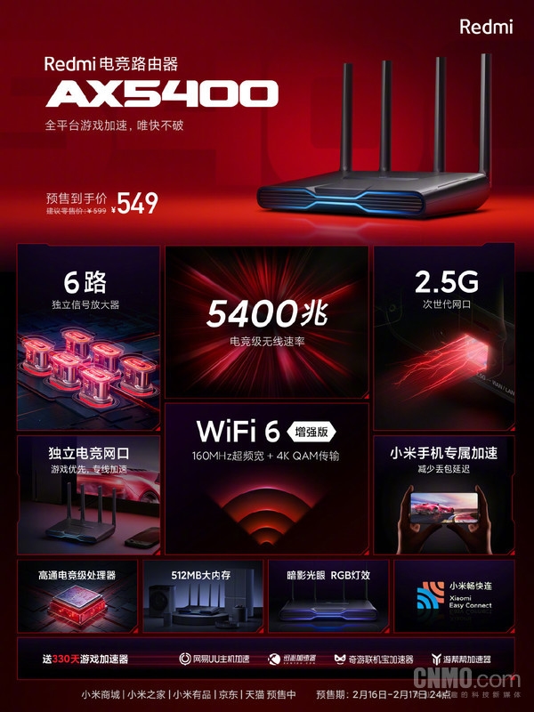 除了发布新机器,在本次新闻发布会上,Redmi还发布了Redmi电子竞技路由器ax5400。