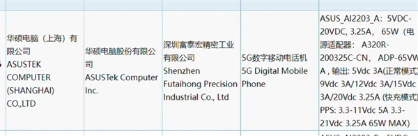 今天,ROG游戏手机6D(型号为ASUS_AI2203)获得3C认证,相关认证信息显示,该机支持65W超级快充。