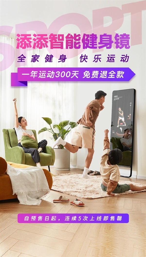 值得一提的是,添添智能健身镜还推出了“一年运动 300 天 免费退全款”活动,用户只需要一年时间内坚持300天健身打卡,即可退还全款,详情可前往小度商城查看。