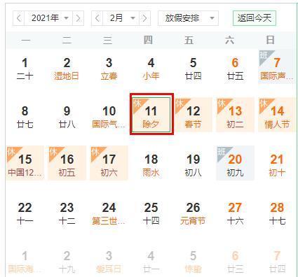 公历2021年中,农历除夕是2月11日