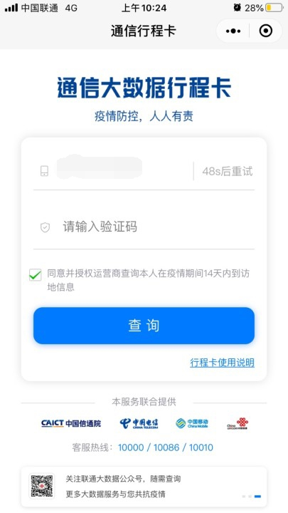 通信大数据行程卡收不到验证码怎么回事? 1、拨打客服热线 如果您在使用过程中打不开网页、收不到验证码或者行程查询出现了问题,请立即拨打所属运营商的客服热线,还是您熟悉的10000/10086/10010。 2、使用APP一键查询 下载【通信行程卡】APP后,可以使用本机号码以及登录,无需验证码即可开始查询。 3、切换时段查询 在高峰期使用的时候因为服务器过于拥堵可能会造成验证码无法收到的情况,建议换个时段再查询,才能及时收到验证码。 4、查询网络状态 保证自己在一个良好的网络状态以及顺畅的运营商服务地点查询,确保自己的信号充足,并且手机余额足够,能够接收验证码。