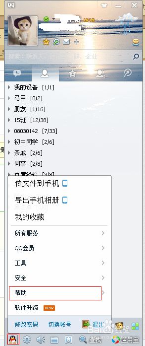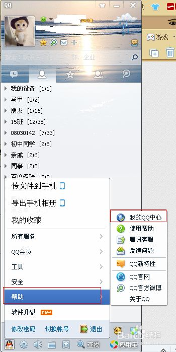2.打开“帮助”选项,在“帮助”选项的下拉菜单中找到“我的QQ中心”