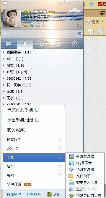 通过QQ号码重新添加 1.进入QQ主菜单,在”工具“选项下找到消息管理器