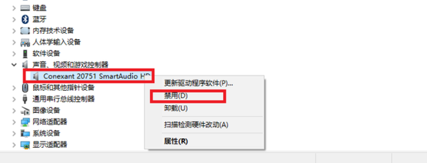 4)右击圈中的声卡右击它,选择“禁用”。