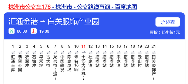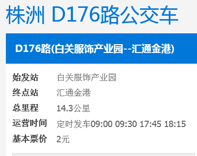 湖南省株洲市公交车D176路尚在正常运营,首班车8.00点, 末班车19.00点。