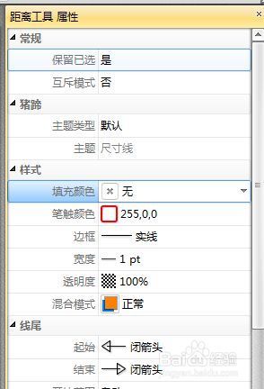 3 然后,我们可以看到PDF文件页面右侧出现的距离工具属性中有关距离工具的样式线尾和引导线等的选项。