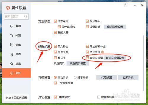 4 进入高级设置后,在候选拓展里选择自定义短语设置。如下图所示: