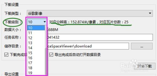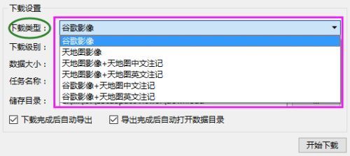 4 进行下载设置。选择下载类型(谷歌影像、天地图影像以及带中英文标注的谷歌影像和天地图影像),下载级别(2-19),数据大小根据选择的下载级别变化,注意下载级别越高(默认值10),对应的分辨率越高,瓦片数越多,数据越大,下载速度越慢。