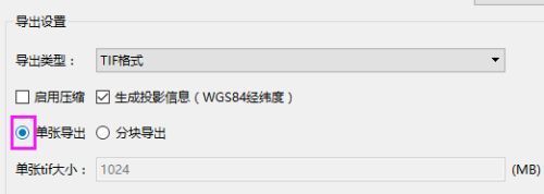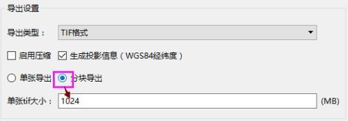 5 进行导出设置。导出类型只有TIF格式,不可更改,自由勾选是否启用压缩以及生成投影信息,选择导出的TIF文件是单张导出还是分块导出,分块导出可以设置每块TIF的大小。