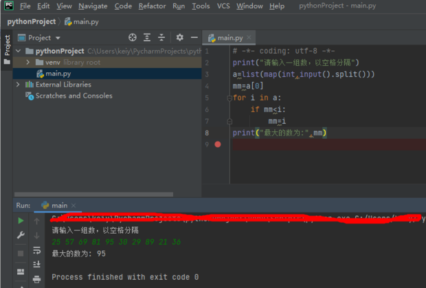 如何用pycharm的for语言编写一个选出最大数字的程序