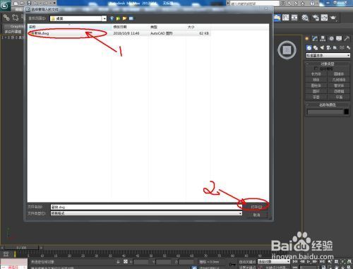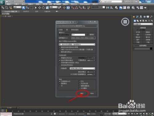 4 打开3Dmax2012软件,点击左上角软件图标,点击【导入】-【导入】,选择新块文件,点击【打开】,弹出对话窗口后,点击确定,平面图便导入了;