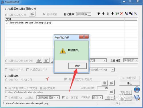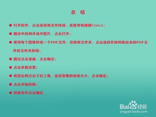 9 总结 打开软件,点击选择源文件按钮,或使用快捷键Ctrl+1; 路径中找到并选中图片,点击打开; 使用每个图像转成一个PDF文件,存放到文件夹,点击选择存放转换出来的PDF文件的文件夹按钮; 路径点击桌面,点击确定; 点击参数设置; 纸型右侧点击下拉三角,选择需要的纸张大小,点击确定; 点击开始转换; 转换完毕点击确定。