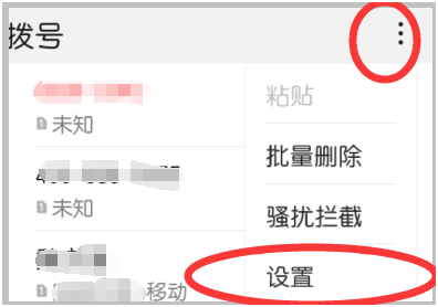 2、进入拨号页面后点击右上角的竖版“ ... ”符号打开下拉菜单,选择其中的“设置”选项。