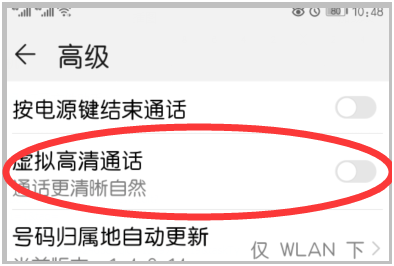 4、点击进入“高级”页面后即可看到“虚拟高清通话”的选项,将其右侧的开关按钮打开即可。
