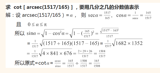 故 cot [ arcsec(1517/165) ] = cotx = 165/1508 。