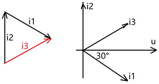 i3 = i1 + i2,且三者幅值相等,所以如左图,三个向量构成等边三角形;