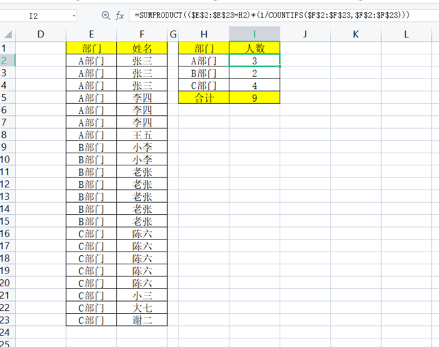 =SUMPRODUCT(($E$2:$E$23=H2)*(1/COUNTIFS($F$2:$F$23,$F$2:$F$23)))